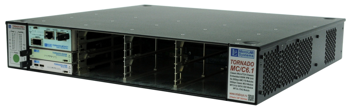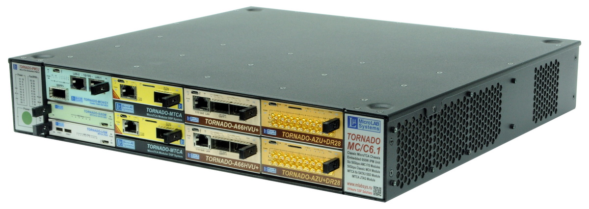 Супервысокопроизводительные модульные комплексы и системы ЦОС и обработки РЧ-сигналов стандарта MicroTCA на базе AdvancedMC (AMC) модулей ЦОС TORNADO-A фирмы МикроЛАБ Системс и инфраструктурных компонентов MicroTCA фирмы NAT GmbH (шасси, модули MCH, модули PM источников питания).