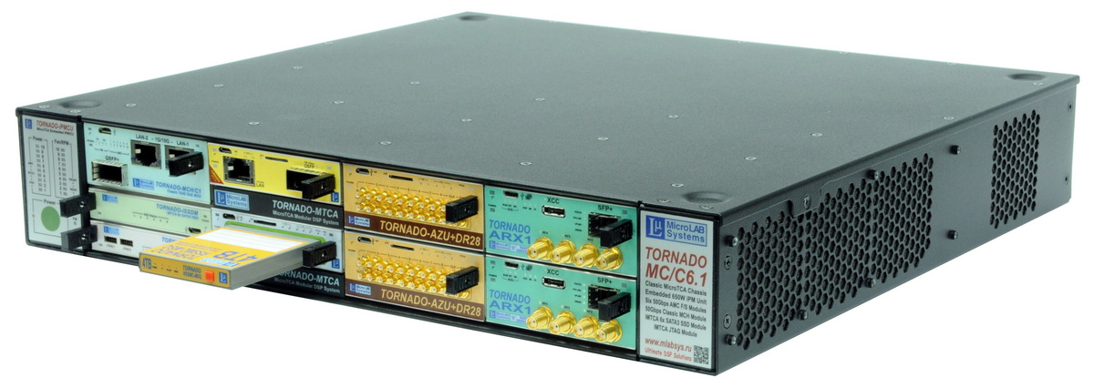 Супервысокопроизводительные модульные комплексы и системы ЦОС и обработки РЧ-сигналов стандарта MicroTCA на базе AdvancedMC (AMC) модулей ЦОС TORNADO-A фирмы МикроЛАБ Системс и инфраструктурных компонентов MicroTCA фирмы NAT GmbH (шасси, модули MCH, модули PM источников питания).