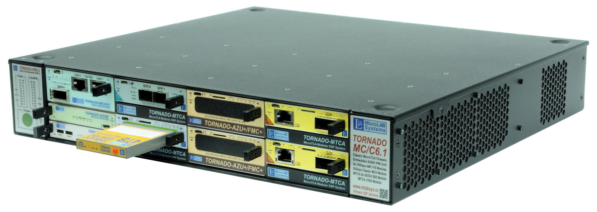 TORNADO-MTCA/TA анализа и записи трафика в шасси TORNADO-MC/C6.1 "классического" стандарта MicroTCA с прикладными процессорными AMC-модулями TORNADO-AP2160, AMC-модулями TORNADO-AZU+/FMC+ с СнК ПЛИС+ARM и AMC-модулем T/AX-DSFPX с портами SFP+ 10GbE LAN/WAN