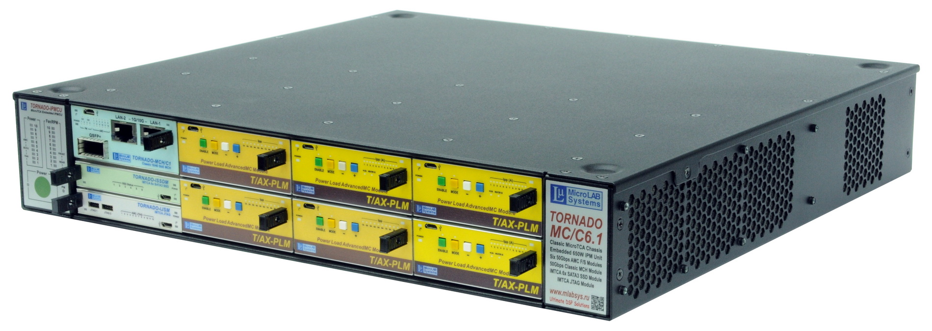 • Шасси TORNADO-MC/C6.1 высотой 1.5U со слотами для 6-ти полновысотных AMC-модулей, встроенным источником питания и вентиляцией, слотами для инфраструктурных модулей TORNADO-MCH, iJSM, iSSDM/S6, и автономной работой с включением/выключением по расписаннию